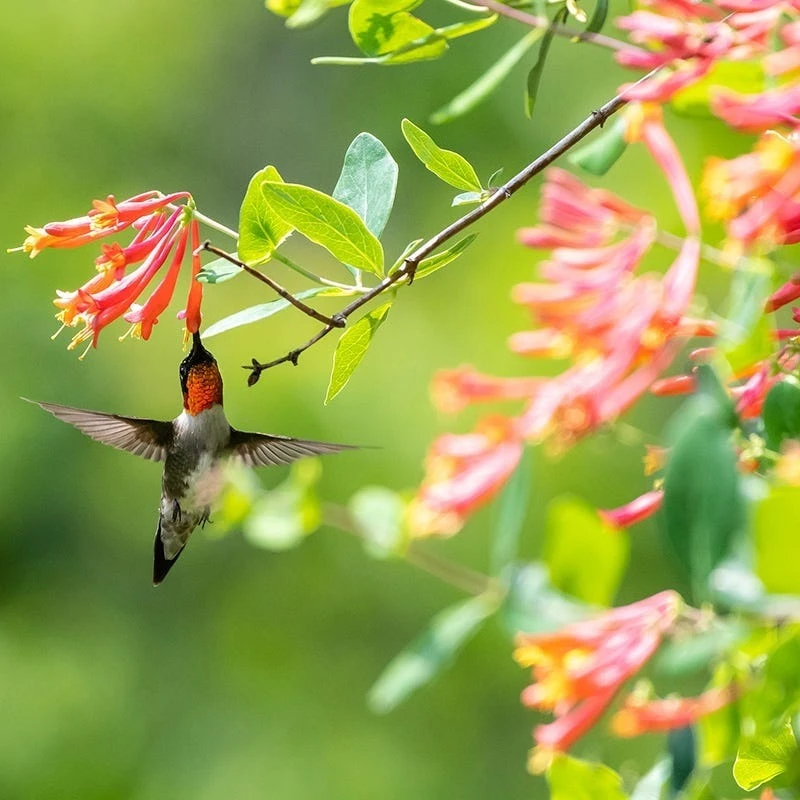 6-8′ x 5-10′ wide. Lonicera sempervirens ‘Major Wheeler’ (Honeysuckle Vine) puts on a hummingbird display unrivaled by any other Honeysuckle variety. Garden trials have demonstrated that this is the most profuse bloomer of its species. With its mass display of thin tubular, red-orange flowers from late spring through the end of summer and highly disease resistant foliage, ‘Major Wheeler’ Honeysuckle is a low care, high color addition to the landscape. Bring hummingbirds up close to your patio by training ‘Major Wheeler’ onto a nice trellis or pergola. A fast growing vine, use it to quickly cover unsightly fences. Partially evergreen in southern climates, deciduous in colder zones of the north. Because this blooms on old and new wood, there is no need to prune other than to shape the vine once blooms have passed. 2010 Plant of the Year.